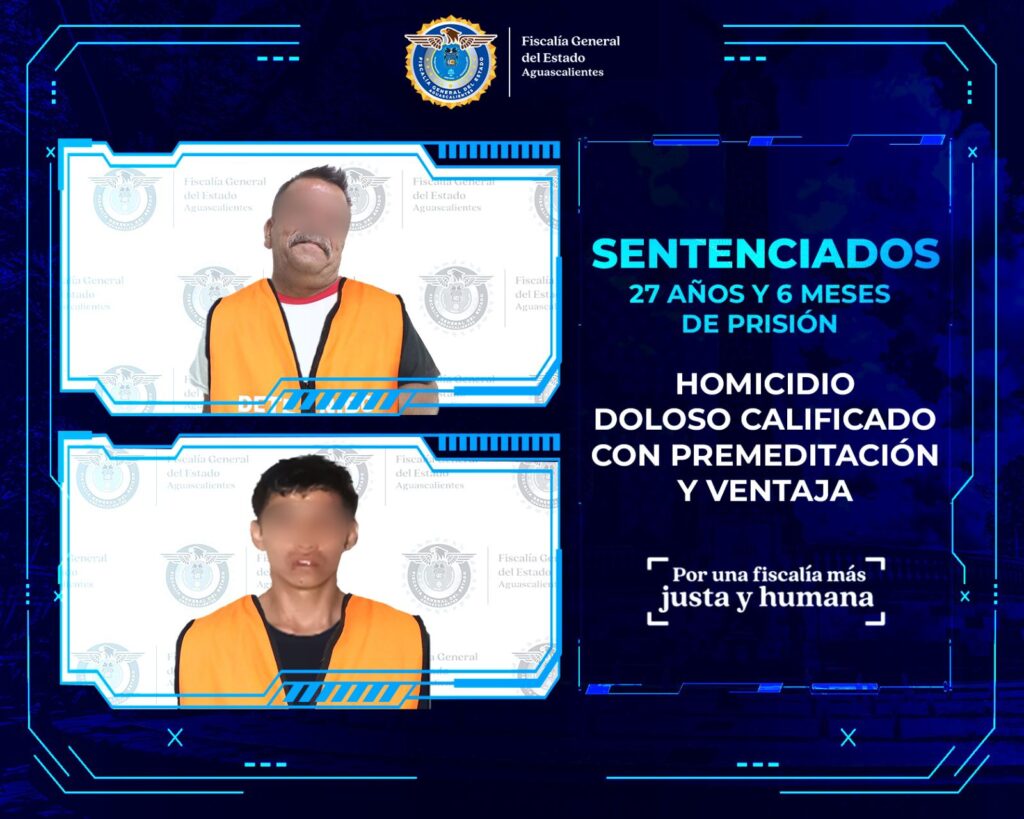 La Fiscalía General del Estado de Aguascalientes logró obtener una sentencia condenatoria en contra de Christopher Orlando “N” y Ángel Fabián “N”, sujetos generadores de violencia que fueron encontrados penalmente responsables del delito de homicidio doloso calificado con premeditación y ventaja, imponiéndoseles una pena de 27 años y 6 meses de prisión para cada uno, además del pago de 325 días de multa y la reparación del daño a favor de los deudos de la víctima.