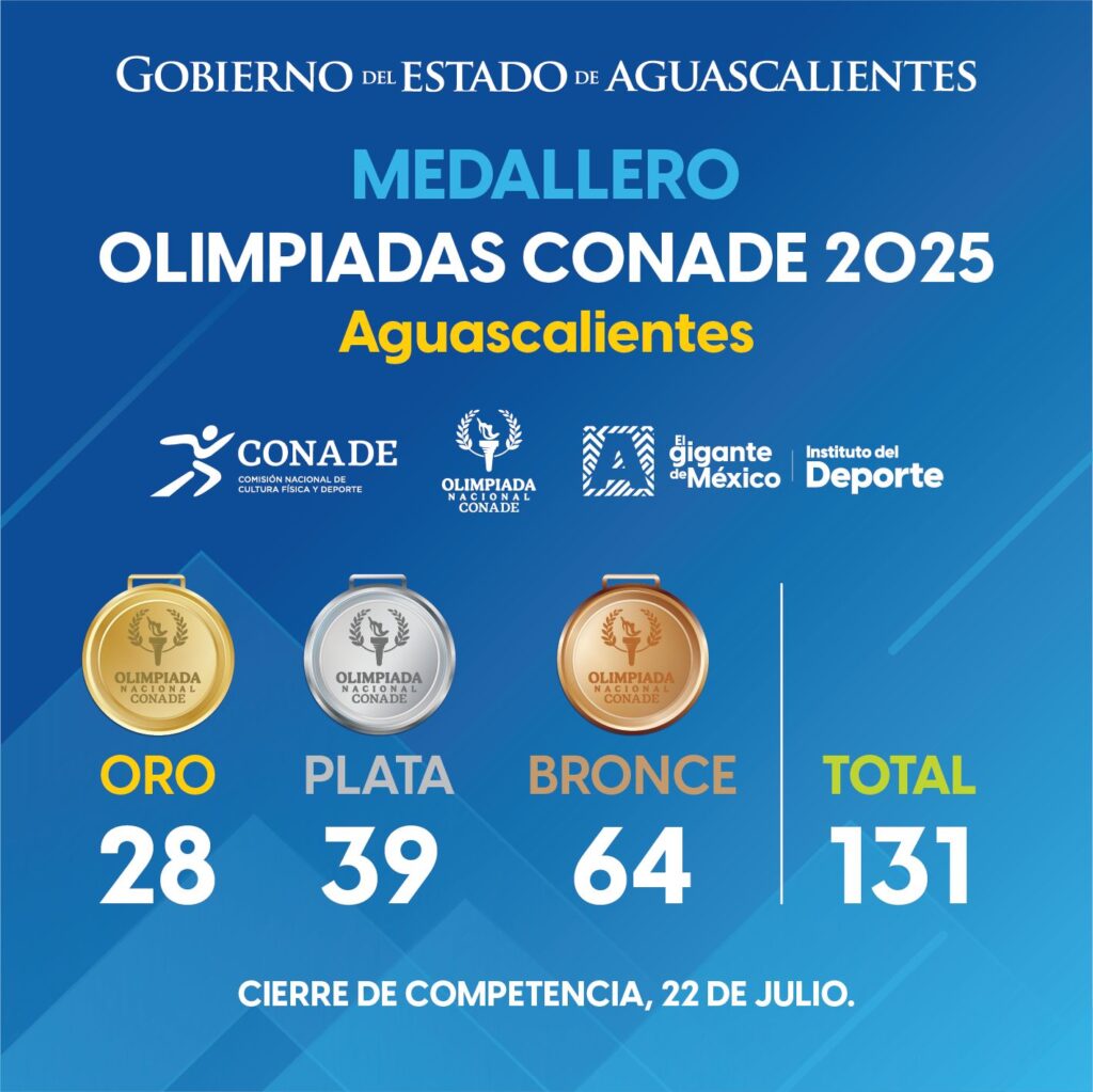 Las y los deportistas de Aguascalientes concluyeron su participación en la Olimpiada Nacional CONADE 2025, la justa más importante a nivel amateur en el país, con un total de 131 medallas, de las cuales 28 fueron de oro, 39 de plata y 64 de bronce.