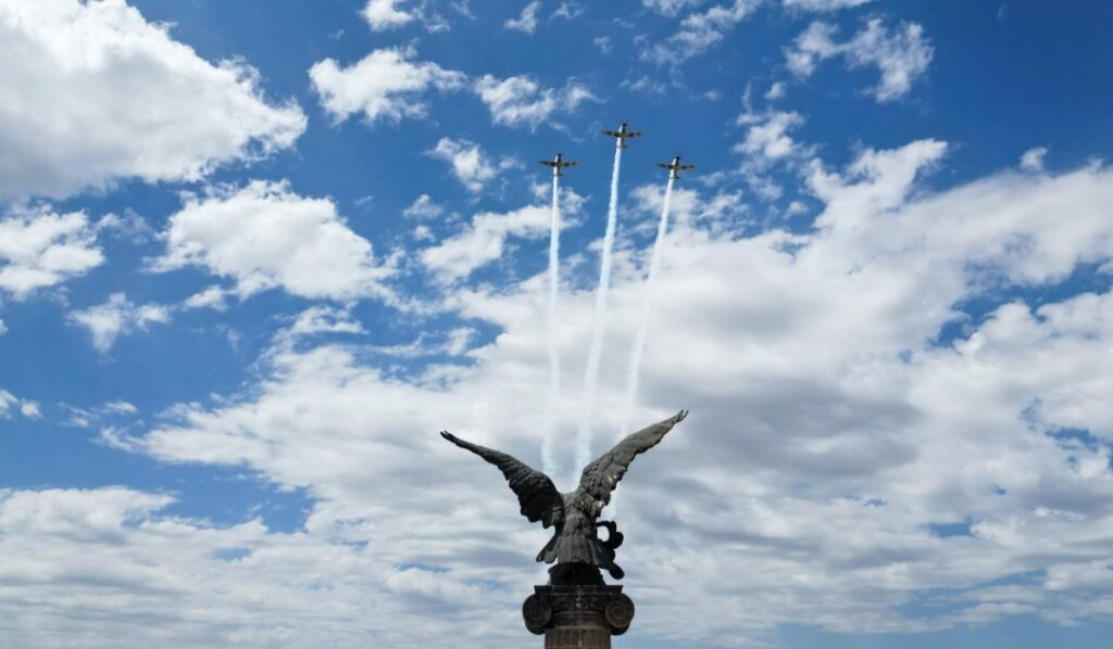 Tres aviones Texan T-6C de la Fuerza Aérea Mexicana surcaron el cielo con tres vuelos en formación que miles de personas presenciaron desde la exedra de la Plaza de la Patria en el Centro Histórico.
