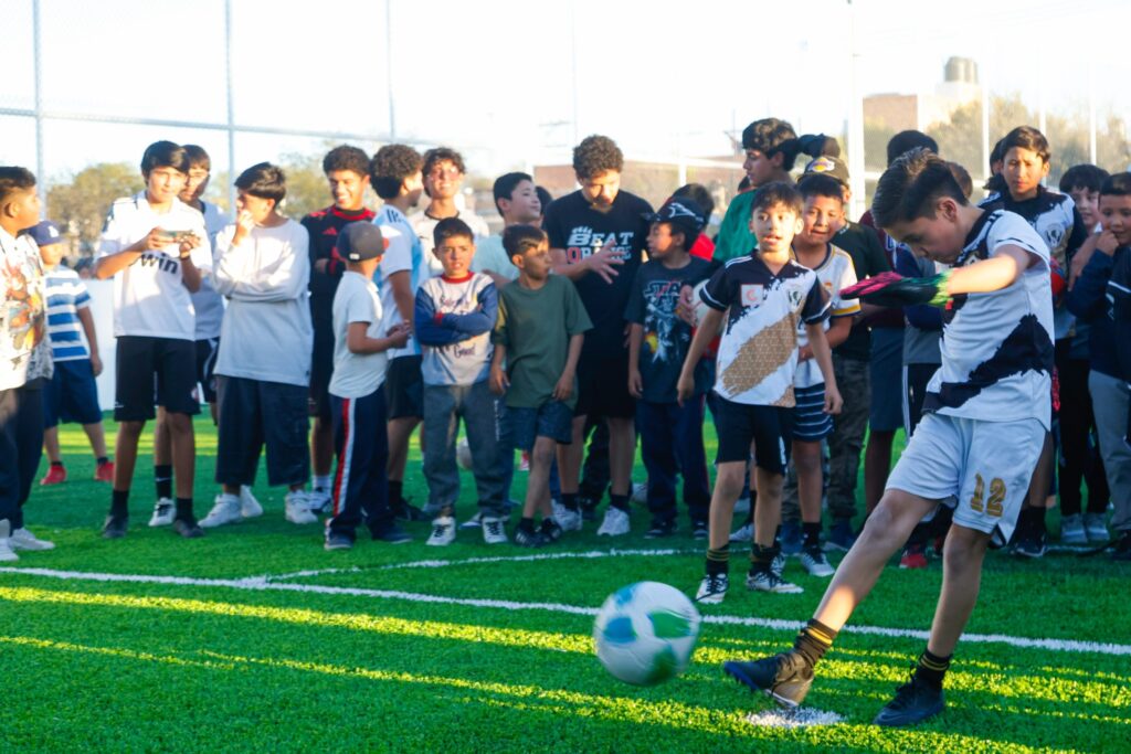 La entrega de la primera etapa está conformada de mil 500 metros cuadrados de construcción de cancha de fútbol siete de pasto sintético, andadores, barda perimetral, instalación de malla ciclónica e iluminación, para seguridad de quienes harán uso de este nuevo espacio.