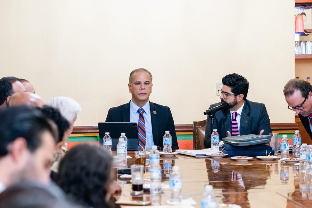 El secretario general de Gobierno, Antonio Arámbula, sostuvo una reunión de trabajo con integrantes del Colegio de Notarios del Estado de Aguascalientes, encabezados por su presidente, Fernando López Velarde Pérez; así como con el subsecretario de Gestión Normativa y Derechos Humanos, Jorge Armando García Betancourt, y el titular del Instituto Registral y Catastral del Estado, Miguel Romo Reynoso.