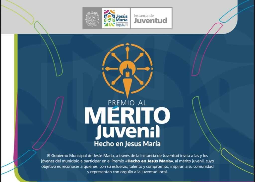 El Gobierno Municipal de Jesús María, a través de la Instancia de la Juventud, invita a las y los jóvenes del municipio a participar en el premio “Hecho en Jesús María” al Mérito Juvenil, con el objetivo de reconocer a quienes, con su esfuerzo, talento y compromiso, inspiran a su comunidad y ponen en alto el nombre de la juventud local.