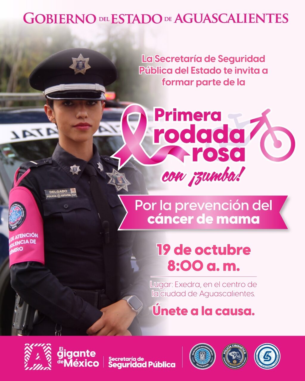 La Secretaría de Seguridad Pública del Estado de Aguascalientes (SSPE) te invita a participar en la Primera Rodada Rosa con Zumba, que se llevará a cabo el domingo 19 de octubre, en el marco del Día Internacional de la Lucha contra el Cáncer de Mama.