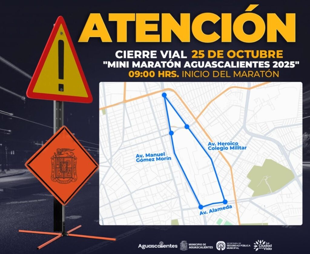 El director de Movilidad y Tránsito, José Luis Rodríguez Montoya, de la Secretaría de Seguridad Pública Municipal (SSPM), informa a la ciudadanía sobre los cierres viales que se implementarán con motivo de la carrera “Mini Maratón Aguascalientes 2025”, la cual se llevará a cabo el sábado 25 de octubre, a partir de las 09:00 horas.