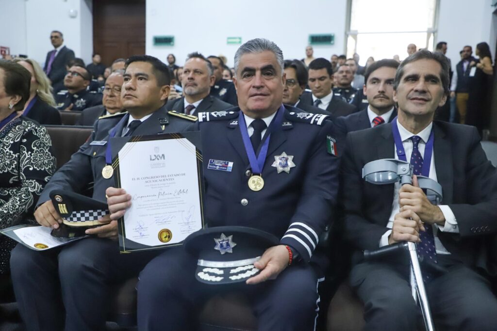 Al presidir la entrega de medallas que otorga el Poder Legislativo a ciudadanos, organismos e instituciones que se distinguen por sus aportaciones a la sociedad, la gobernadora de Aguascalientes, Tere Jiménez, hizo un reconocimiento especial a la Policía Estatal, luego de recibir la presea “Benito Juárez García” por la labor que realiza a diario para mantener la paz y la tranquilidad en la entidad.