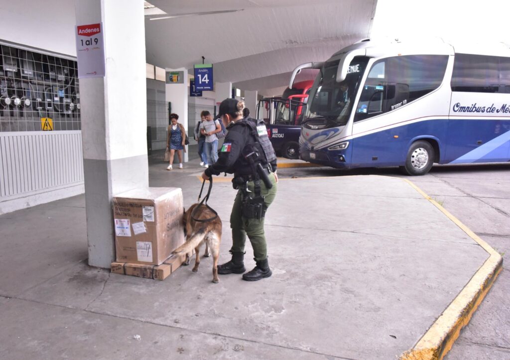 Con el objeto de garantizar la seguridad de viajeros que utilizan el servicio de autobuses foráneos, la Secretaría de Seguridad Pública del Estado (SSPE), en coordinación con personal del Ejército Mexicano y Guardia Nacional, intensificó la vigilancia en las instalaciones de la Central Camionera, donde uniformados de estas corporaciones se mantienen de guardia 24/7.