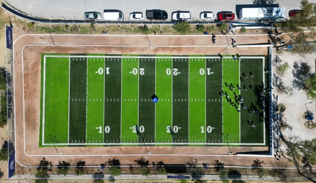 Leo Montañez destacó que, gracias al Presupuesto Participativo ahora la ciudad de Aguascalientes cuenta con la primera cancha pública de tochito bandera de pasto sintético en beneficio de las infancias que practican este deporte, ya que cuenta con las medidas oficiales de la Federación Internacional de Fútbol Americano y Flag Football.