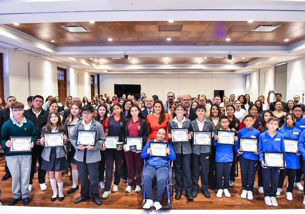 La gobernadora de Aguascalientes, Tere Jiménez, entregó becas a estudiantes que representarán a México en competencias internacionales en Estados Unidos y Singapur; así como apoyos a los ganadores de la Olimpiada del Conocimiento Infantil 2025.